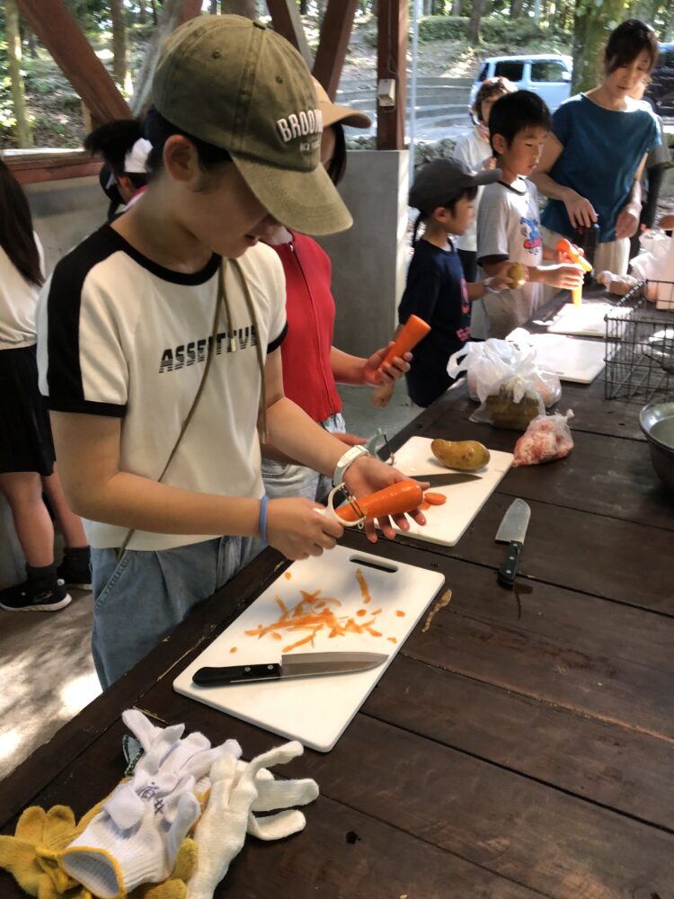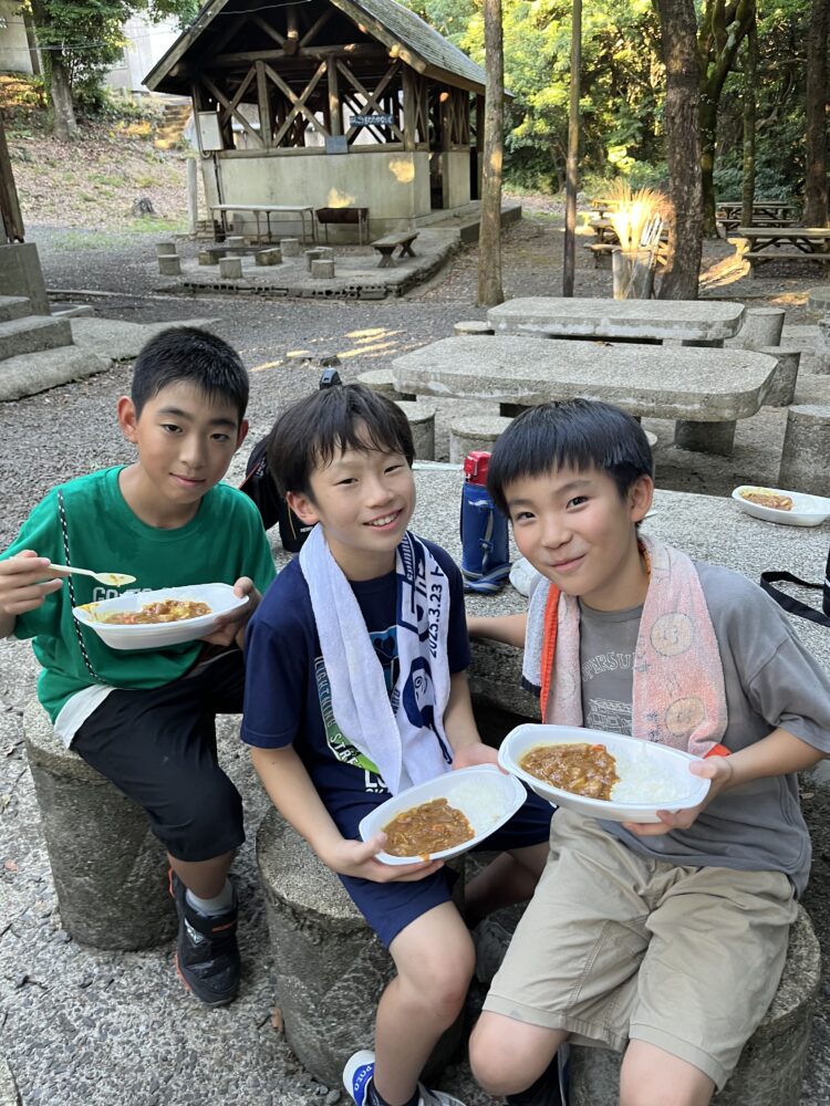 火起こしから調理まで、すべて子どもたち主体で挑戦したカレー作り。薪に火をつける難しさや、包丁を使う緊張感、仲間と役割分担する大切さを学びました。外で食べる自分たちのカレーの味は格別「家では野菜を食べないのに完食しました!」という声も。