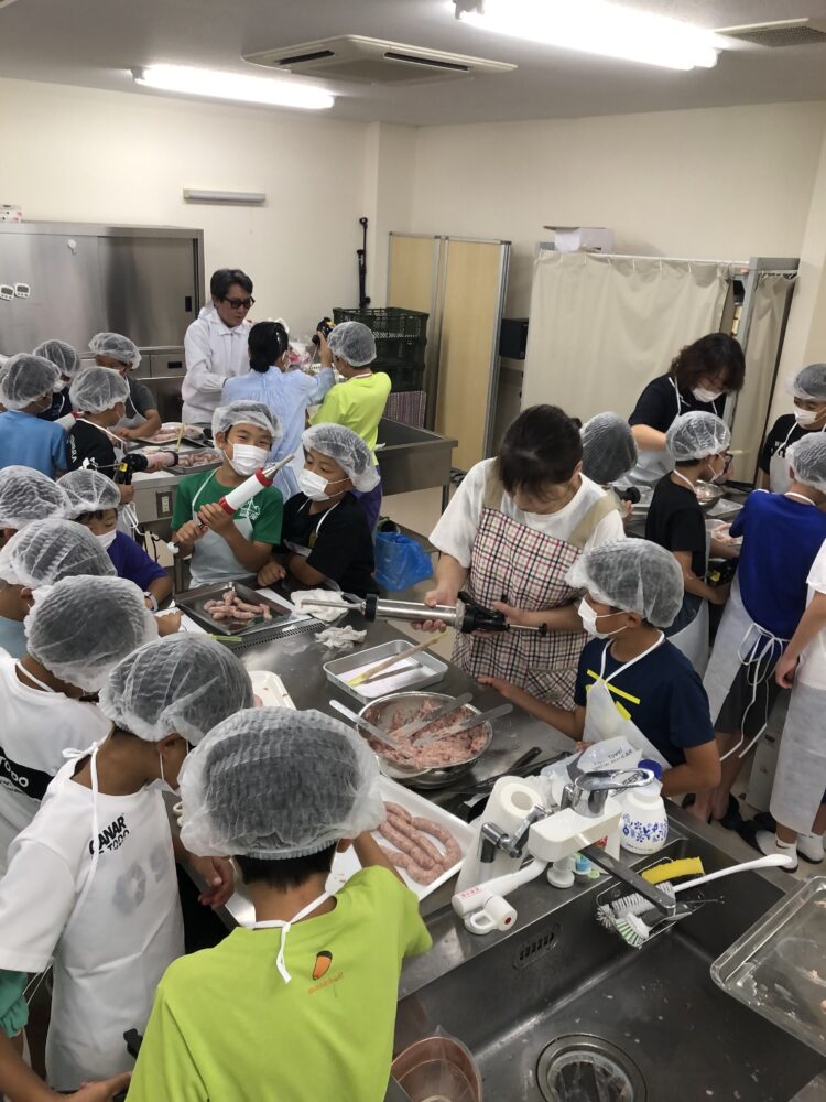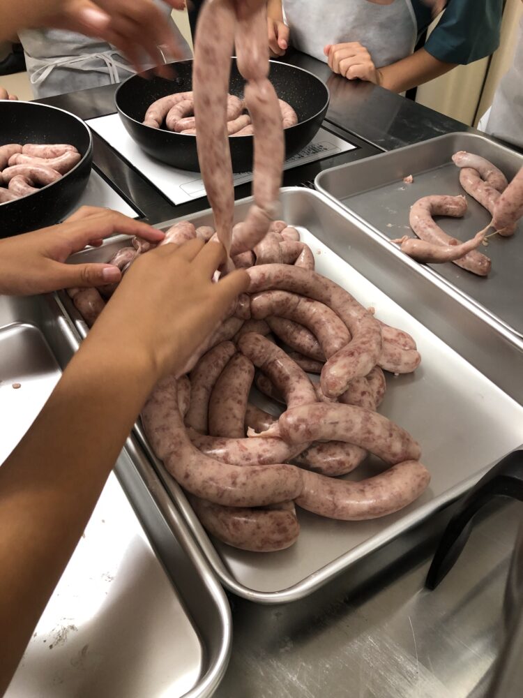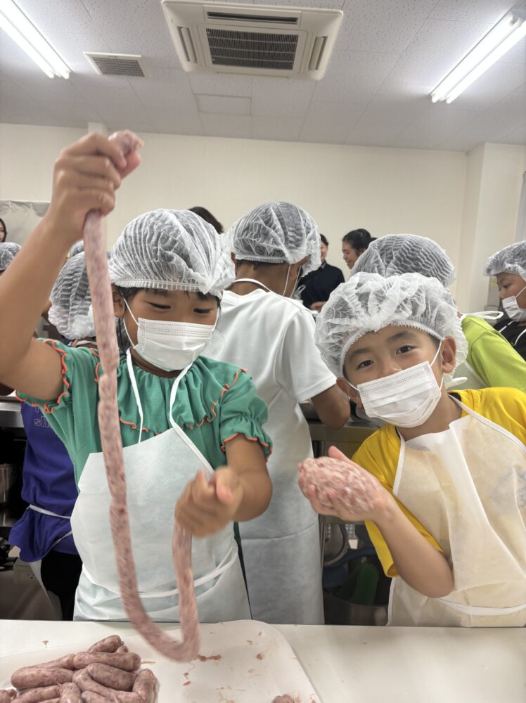 普段食べているウインナーがどのように作られているのかを学びながら、自分たちで手作り体験。お肉をこね、腸詰めし、形を整える工程は真剣そのもの。